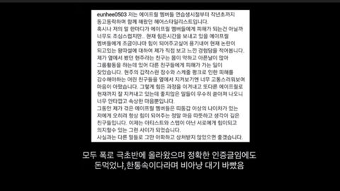 근데 나도 몇가지 의문인게 ㅎㅈ엄마한테 보낸 폭언문자 왜 공개 안하는지, 본인 왕따시킨거 처벌받으라고 나타난걸텐데 이제와서 왜 ㅇㅇㅍㄹ욕하지 말라는건지 이건 궁금함.
