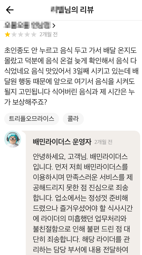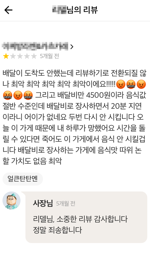 리뷰 원본글은 팩트 후드려맞은 진상이 삭튀해서 못 봤는데 사장님 답변 보니까 대충 견적 나옴.. 사장님 마상 심하셨을 거 같은데 조목조목 침착하게 짚어가면서 패버리시네