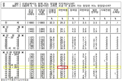 특히 18세 이상 29세 미만 여성의 국민의힘 지지율은 1%로 나타났다. 더불어민주당(27.6%), 정의당(5.6%), 국민의당(6.8%)과 비교해 크게 낮았다.