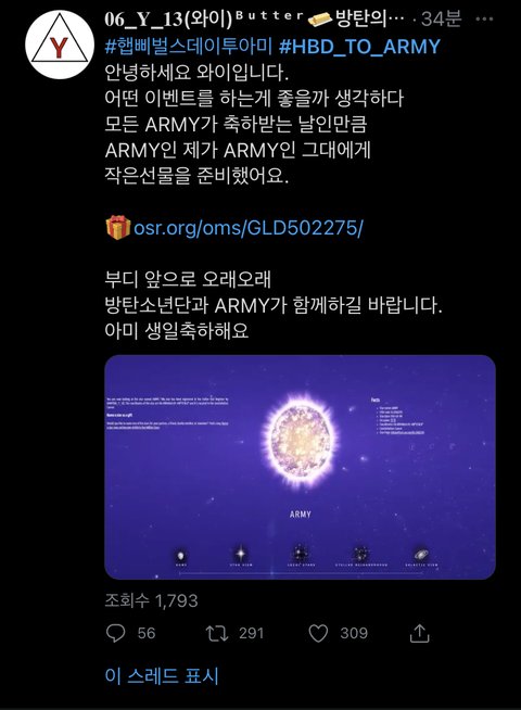 아미들 진짜 뭐하는 사람들이냐 오늘 아미 만들어진 날인데 그 기념이라고 ARMY 이름으로 별 산건데 소리까지 들으면 개쩜…
