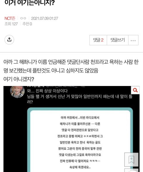 나도 그사람이 쓴 댓글들 봤는데 걔가쓴 주접 댓글로 애들 엄청 웃고 해촨이가 ㅇㅇ씨 사랑해요 ~ 해줬는데 해챤이 관련 댓글 안올리고 천너 주접만 올라오긴 했어