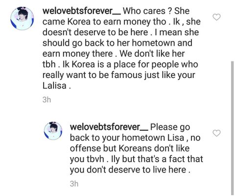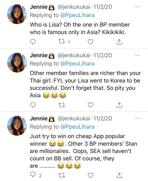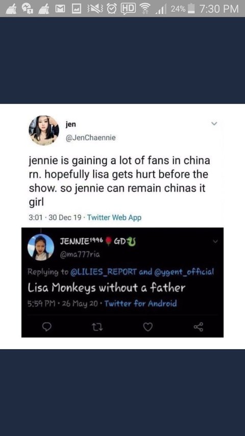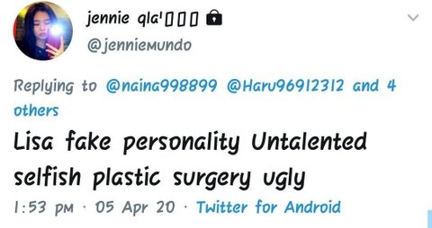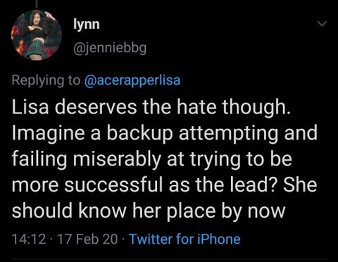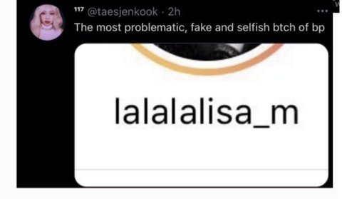 한 대형 독신 팬 계정은 한국이나 한국과는 상관없는 리사 팬 계정의 이전 트윗을 오해의 소지가 있는 스크린샷을 올렸지만, 이 관리자는 이 스크린샷을 한국인이나 한국인과 무관한 것처럼 만들고 여전히 그것이 그들의 나라에 있는 어떤 안티에 관한 것이라는 것을 듣기를 거부한다. 이 반역자들 대부분은 병적인 거짓말쟁이들이고, 거짓말을 한 후에 그들이 잡히면 피해자 역할을 할 것이다. 철저한 확인 없이 그러한 내용을 게시함으로써 또 다른 인종 차별주의자, 외국인 혐오자, 비속어적 발언, 그리고 양측의 체면을 구기는 발언으로 이어질 수 있다. 그들이 정말로 그녀의 명성을 모든 곳에서 망치려고 하는 것처럼 보이기 때문에 당신이 그것을 여기서 본다면 나는 놀라지 않을 것이다.