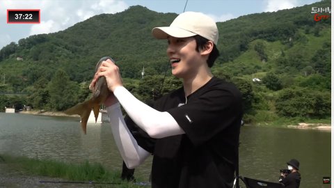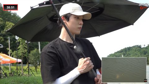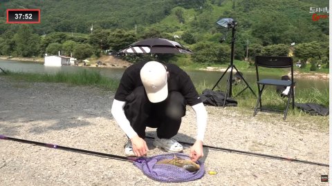 향어가 떨어져서 움직이니까 향어를 때리면서 "가만 있어!"