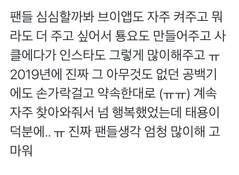 용이 뭘 많이 해줌 공항에서 짬내서 밥먹을때도 브이앱 켜주고ㅠ 늦은 밤에 작업실에서도 자주 켜주고ㅠㅠ ㅇㄴ