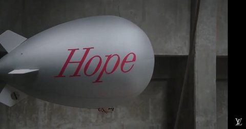 패션쇼 때 비행선에 HOPE,