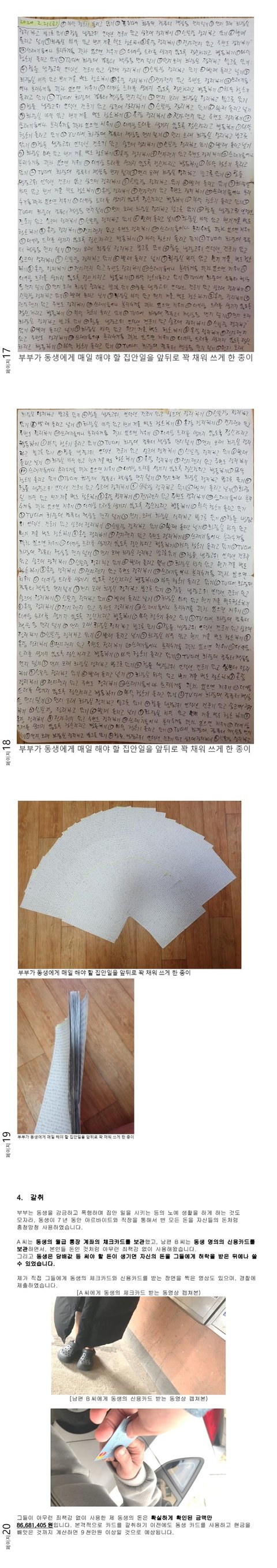 4. 집안일(청소, 고양이 똥 치우기 등)시키고 제대로 안 할 경우 폭행 및 벌금, 깜지쓰기 강요