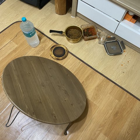 상다리 하나 흔들거리는 거 무시하고 걍 먹으려다가 생수병 올려 놓으니까 무너져버림 근데 ㅅㅂ ㅋㅋㅋㅋ 미끄럼틀 타듯이 미끄러져서 바닥에 안정적으로 안착함 김치 국물만 조금 튀었다