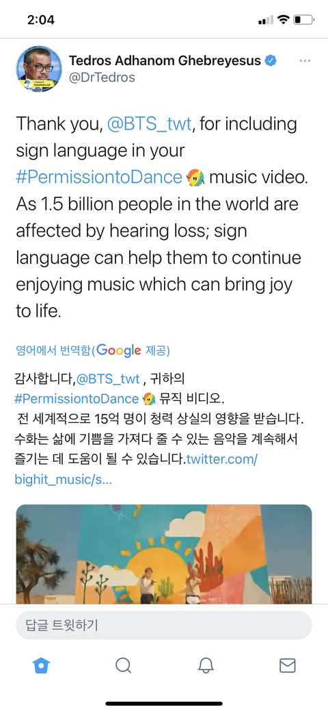 무려 Whㅇ(세계보건기구) 사무총장님이 트윗해주심