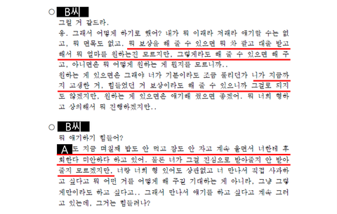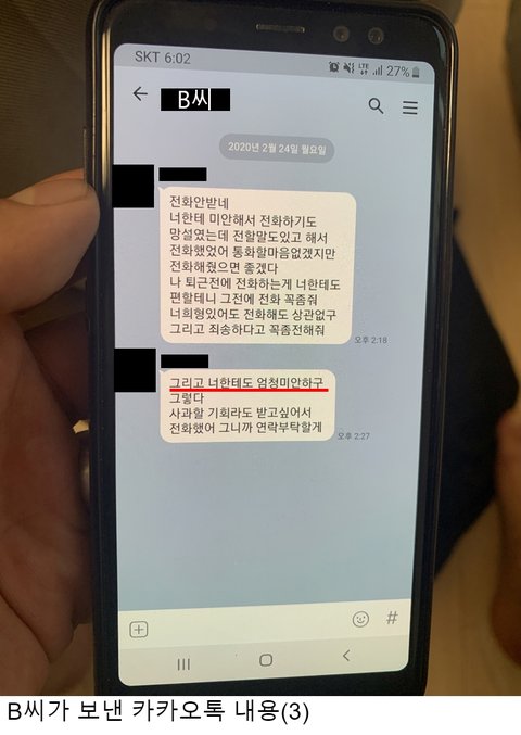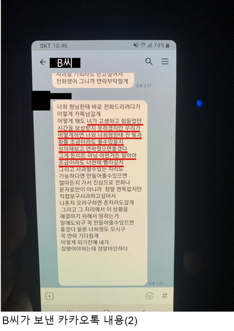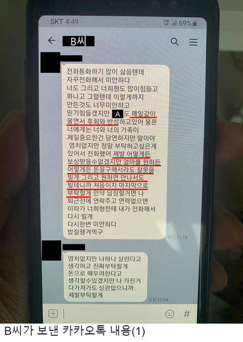 ① 동생의 상황을 눈치챈 직장 상사(Y상사 상무님)이 촬영한 A씨와의 카카오톡 동영상