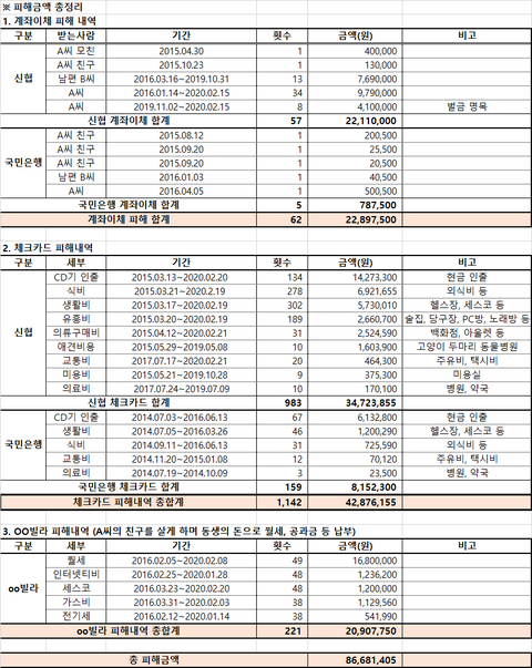 3. 동생 카드 갈취하여 7년간 약 9천만원 유흥비, 생활비 등으로 사용 + 동생 명의로 월세방을 구하게 하여 A씨의 친구를 약 5년간 살게하며 월세와 공과금 등을 동생의 돈으로 냄(본인들은 모아둔 돈으로 빌라와 팰리세이드 신차 구매)