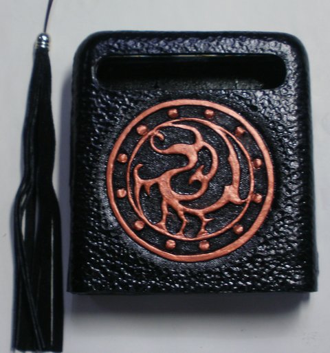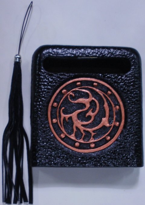 가죽에 삼족오를 카빙하고 천연 염색하여 수작업으로 제작한 핸드메이드 폰케이스(Z플립)입니다.(마디샤가죽공예)