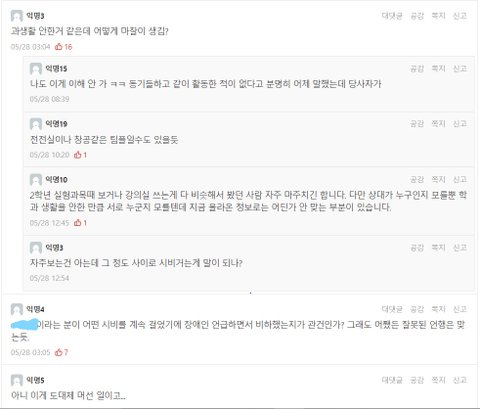 저는 학교 수업외에 일절 학과활동을 하지 않았습니다. 저는 00학과 이외에도 평소에 외모비하를 자주 당했습니다. 2019년 2학기 때 수업시간에는 몇몇 16학번 학생들이 뒤돌아서 지속적으로 저를 응시하고 제 웃긴 표정이 나올 때까지 쳐다봤습니다. 그리고 쉬는 시간에는 각종 모욕과 비하발언을 들었습니다. 이미지에 나와있듯이 장애인비하와 제 외모관련 비하를 제 옆에서 제가 듣고 있음에도 대놓고 했었습니다. 학과 학생들이 말한 장애인비하와 외모관련 비하는 학과 말고 길에서나 다른 곳에서도 종종 듣는 말이었습니다.