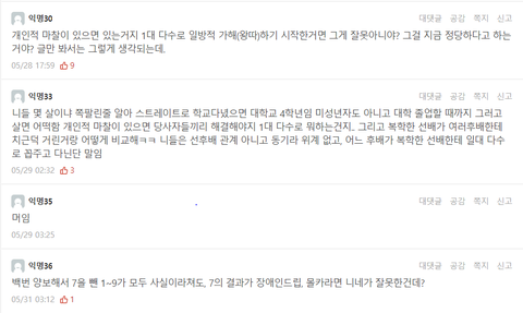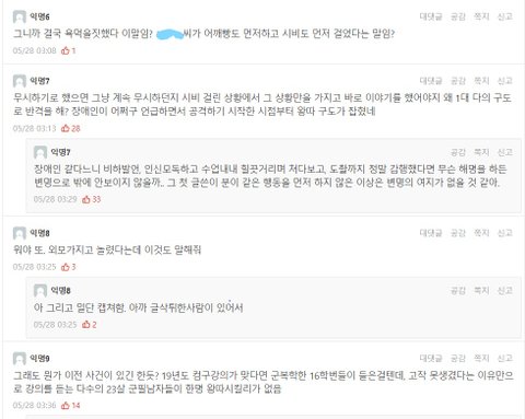 제가 그 당시에 할 수 있는 건 없었습니다. 저는 그 이후에 바로 옆에 있는데 들리게 외모 비하, 뚫어지게 쳐다보기, 도촬(증거는 없고 정황만 있습니다.), 어깨빵을 당했습니다.