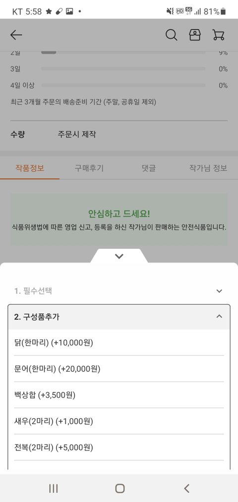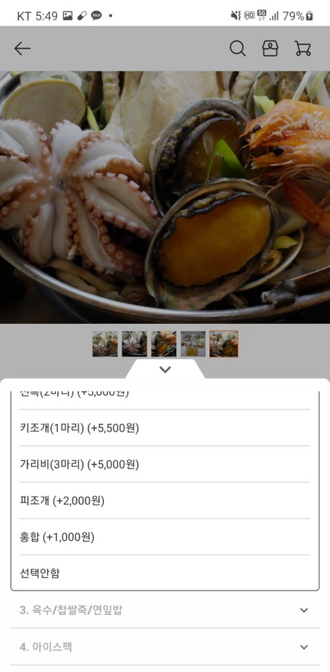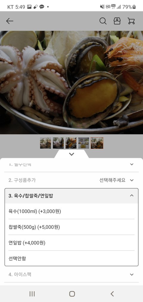 내가 구매한패키지는 39,900원이었고 각 구성품을 추가 할수있는데 그 구성품을 보면 문어 2만원 닭 1마리 1만원 새우 2마리 1천원, 백상합 3,500원,전복2마리 5천원 ..이었음.
