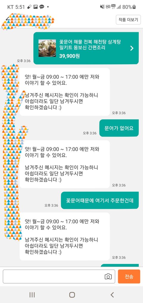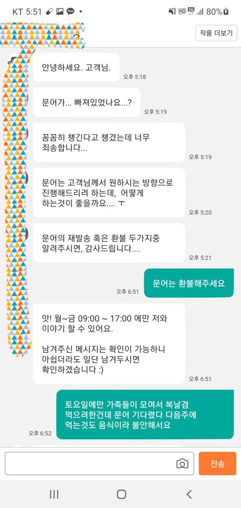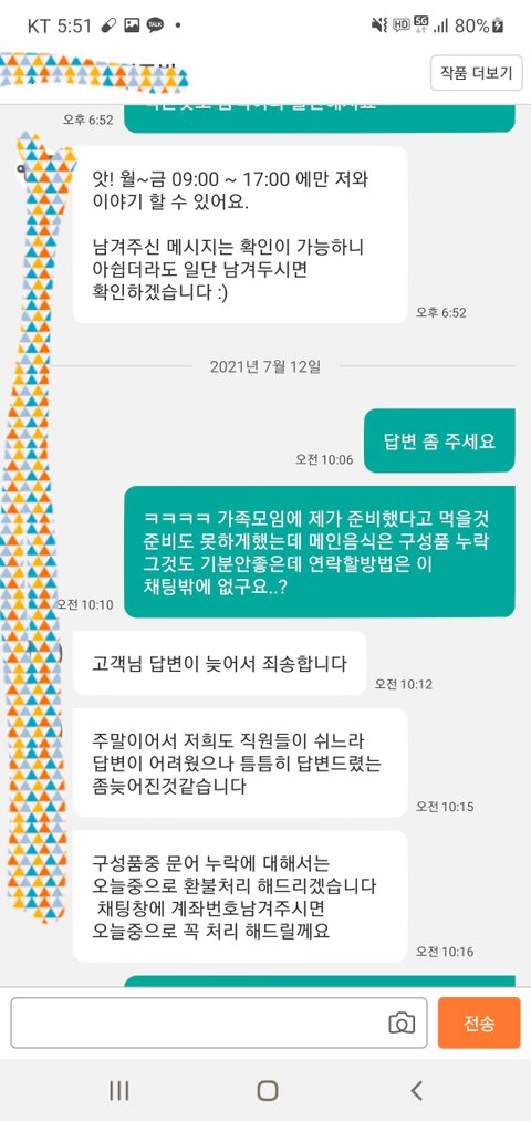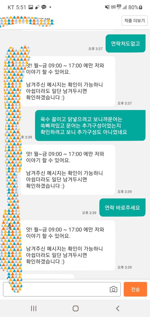 그러나 돌아오는 답변은 앗! 저와는 평일 몇시부터 몇시까지만 대화가 가능해요 ~하는 매크로답변..음식물이라 시간이 지나면 더 어려워 질것같아 댓글에도 답답한마음에 연락할 길이 없다고 남겼음.