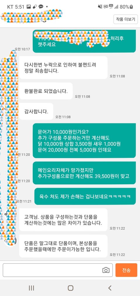 음식물인데다 제일 중요하게 생각했던 꽃문어가 빠져있어 마음이 급했고 우선 판매자와의 채팅에 문어가 없다고 남겨놨음.