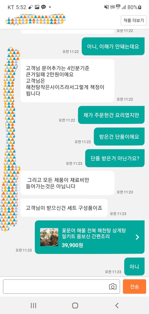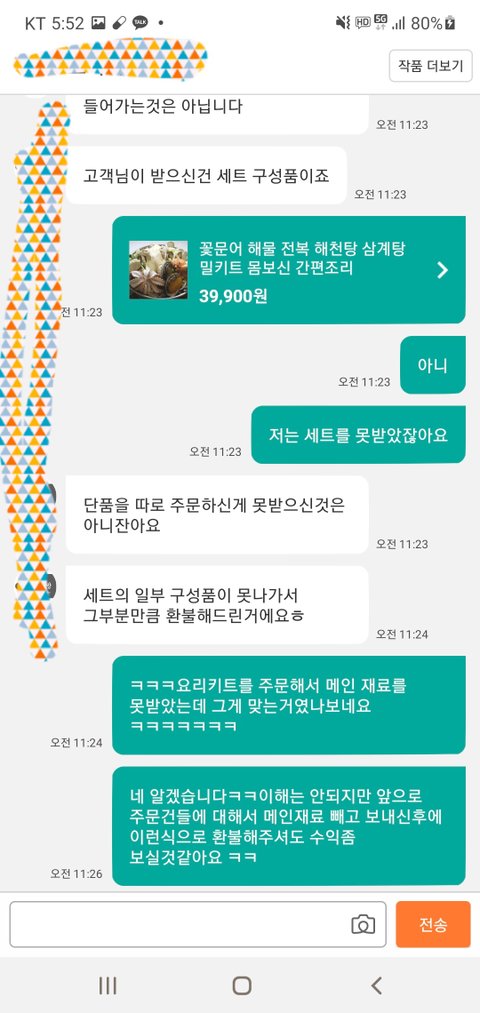 나는 해신탕을 시켯지만 구성품만을 받았다 얘길했지만 말이 안통함.
