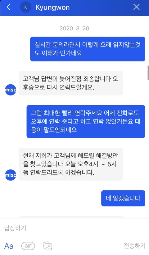 결론은 A/S신청으로 서비스 받은 게 아니라서 안 된다고 함^^^^^^^^^ 게다가 서비스에 문제가 있었던 걸 증명할 수 있냐며… 계속 증명과 증거를 요구하는데 진짜.. 앞으로는 서비스 뭘 받는 사진찍어놔야지 진짜 억울해서..