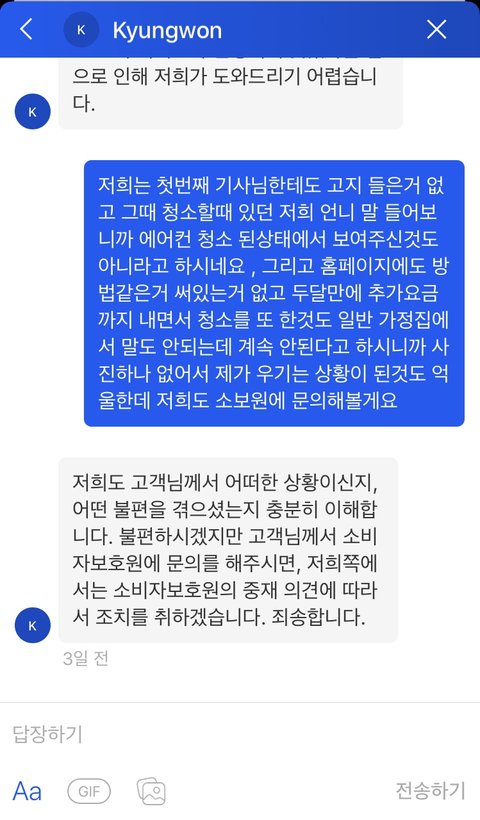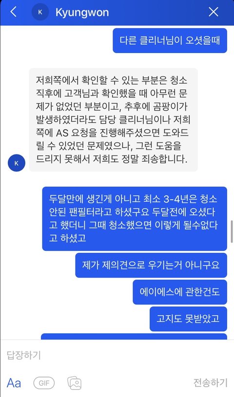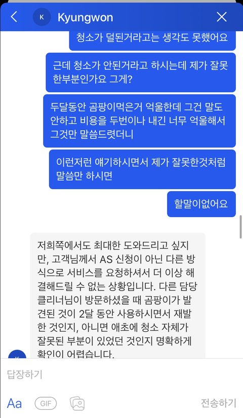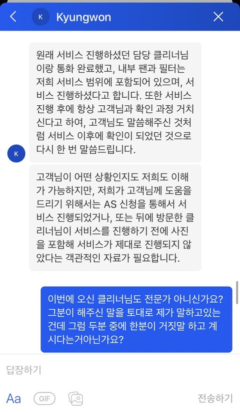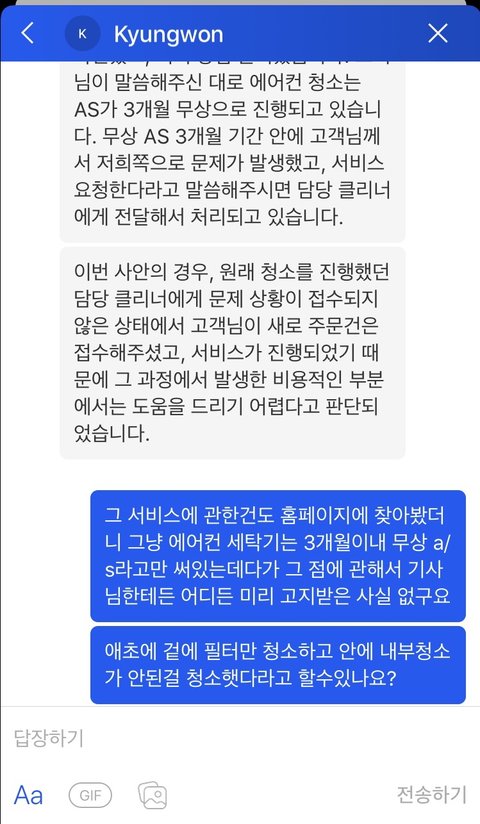 심지어 1번째 아저씨는 우리한테 3개월 A/S 공지도 안 해줬다(그런데 이 새끼는 자기는 청소 잘 마쳤고, 고객님 보여드려서 오케이 받았고 A/S공지도 했다고 우기는 상황. 보여준다고 내가 아냐 강아지야).