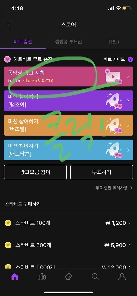 오늘부터 광고 15개 본다는 전제하에 우리가 모을 수 있는 뮤빗(하트비트)은 28x45 = ❤️1260❤️