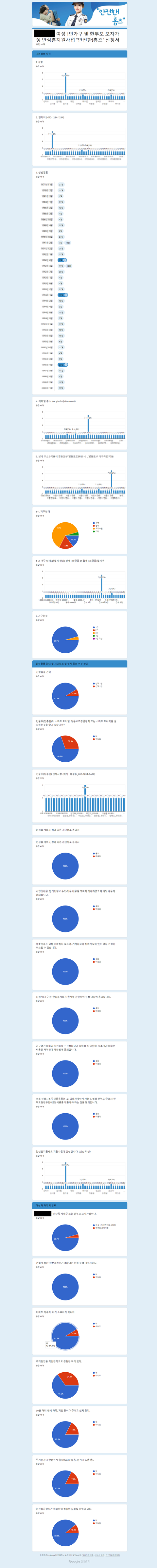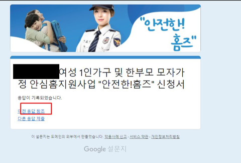 네이트판이 제일 화력이 쌘곳이라 이곳에 올립니다.최근 여성 1인가구 및 한부모 모자가정을 대상으로 안심홈세트 설치를 지원하는 ‘안전한! 홈즈’ 사업을 진행한다고해서 신청서를 구글폼으로 작성했습니다.근데 다 작성하고 나니 이전응답 참조하기 버튼이 뜨길래 뭐지?하고 눌러봤더니..누가 신청했는지 이름이 뭔지 전화번호 이메일 그리고 심지어 집주인 번호까지 쫘아아악 열람이 가능합니다.아니 대가리를 어떻게 쓰면 이렇게 하지?? 건의함에 넣어도 답변도 없어요안심홈 지원이라면서 아주 개인정보 사방팔방 모두 알리고 있어요안전한 홈즈는 무슨 ㅡㅡ 누구나 신청서 작성하면 신청한 사람 누구인지 알게 되는데 아주 범죄자보고 알아서 걸어오라고 돕는건가..