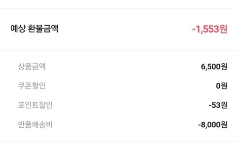 아니 물건이 6500원인데 반품배송비가 8000원이면 어쩌자는 거임?ㅋㅋㅋㅋㅋㅋ 단순 변심도 아니고 사이즈 안 맞아서 반품하려고 보니까 저렇더라 ;;