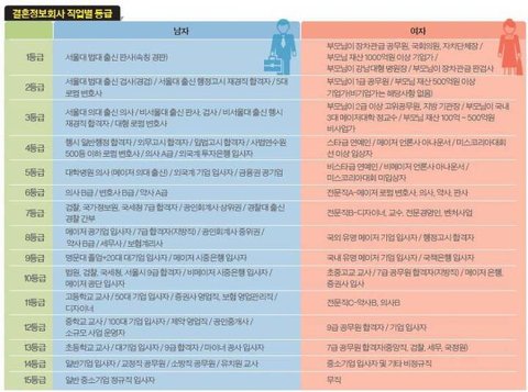 남자는 직업에따라서 평가의 편차가 아주 큼. 다른건 평범하더라도 직업만 좋으면 상위클래스로 올라갈수도 있지만, 반대로 직업이 안좋으면 바로 바닥으로 직행임.