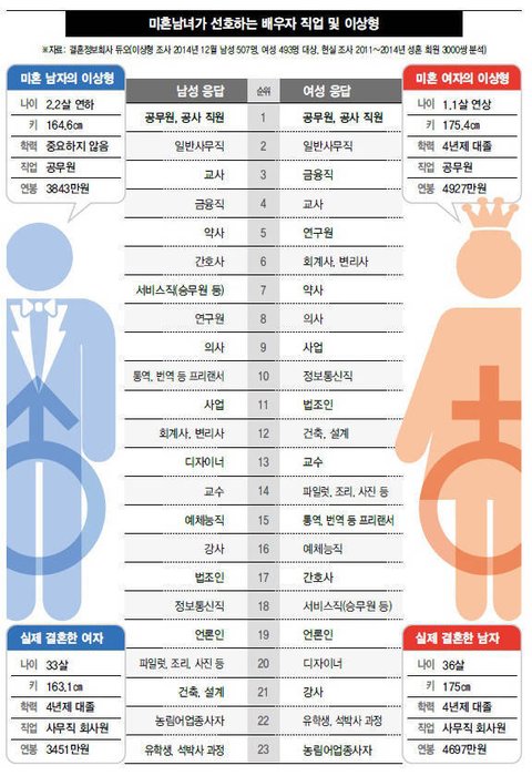 이정도 급에서의 결혼은 2세 조건도 고려하기때문에 우수한 유전자로 판단되는 명문대 학벌과 큰 키를 가진 남자들이 우대받음.