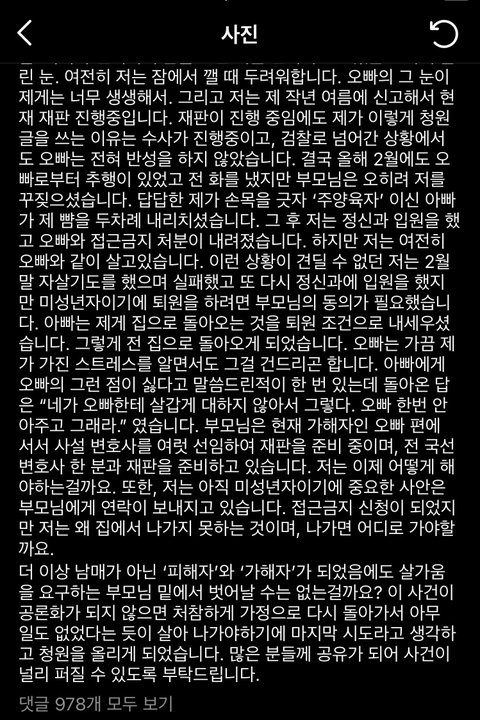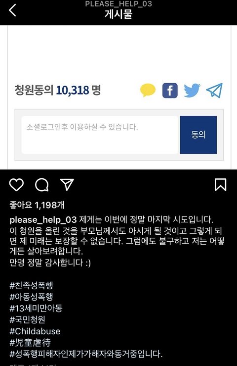 또한 저는 아직 미성년자이기에 중요한 사항은 부모님에게 연락이 보내지고 있습니다. 접근금지 신청이 되었지만 저는 왜 집에서 나가지 못하는 것이며, 나가면 어디로 가야할까요. 더 이상 남매가 아닌 ‘피해자’와 ‘가해자’가 되었음에도 살가움을 요구하는 부모님 밑에서 벗어날 수은 없는 걸까요? 이 사건이 공론화 되지 않으면 처참하게 가정으로 다시 돌아가서 아무 일도 없었다는 듯이 살아 나가야 하기에 마지막 시도라고 생각하고 청원을 올리게 되었습니다.