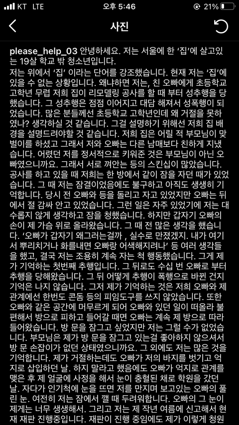 현재 저는 ‘집’에 있을 수 없는 상황입니다. 왜냐하면 저는 친오빠에게 초등학교 고학년 무렵 저희 집이 리모델링 공사를 할 때 부터 성추행을 당했습니다. 그 성추행은 점점 이어지고 대담해져서 성폭행이 되었습니다. 많은 분들께서는 초등학교 고학년인데 왜 거절을 못하였나? 생각하실 것 같습니다. 그걸 설명하기 위해선 저희 집 배경을 설명드려야 할 것 같습니다. 저희집은 어릴 적 부모님이 맞벌이를 하셨고 그래서 저와 오빠는 다른 남매보다 친하게 지냈습니다.
