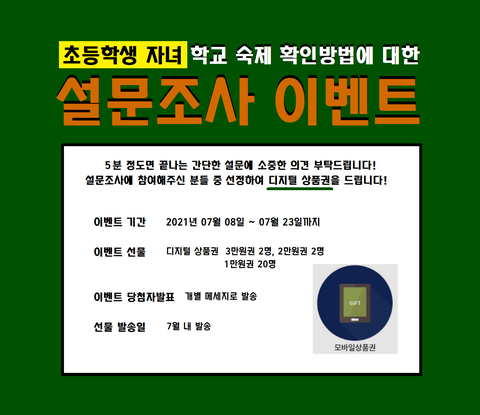 안녕하세요저는 세종에서 조그마하게 교육관련 스타트업을 운영하고 있습니다.학부모님들의 의견을 구하고자 설문요청을 드립니다.설문내용은 ‘초등학생 자녀의 학교 숙제 확인 방법의 불편함’성실히 작성해 주신 분들 중 선정을 통해 디지털상품권을 제공해 드리려고 합니다.