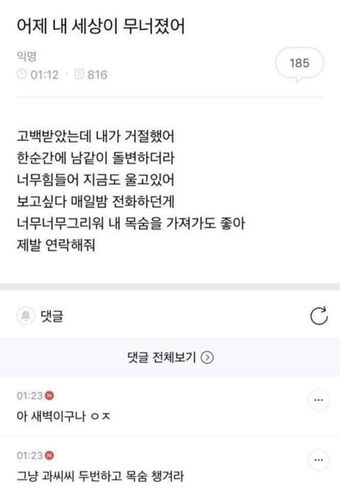진짜진짜... 썸머피날레 텍파 있는사람 나 지금 죽어가고있어 너무 보고싶어서 내 세상이 무너졌어 진쩌 너무 보고싶은데.. 볼수가없어 너무 힘들어 지금도 울고있어 너무너무 보고파 내 목숨 호록