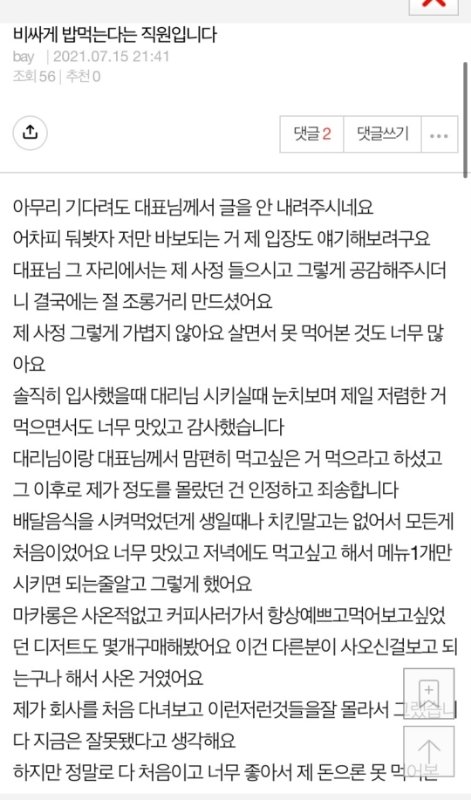 집가난해서 20년동안 못먹은 음식 꼭회사돈으로쳐먹어야함?월급날되면 월급받아서 사쳐드세요..지돈쓰긴아까우니까 회사돈이니 비싸든말든 저녁까지 먹을음식시킨거아님 개념은 돈없다고 전당포에 담보잡혔나 진짜..그러면서 대표가 본인사정안봐준다고 적반하장이네 회사가 기부단체냐 ㅁㅊ것아