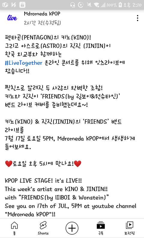 키노 잇츠라이브 떴다! 내일 오후5시래!!!