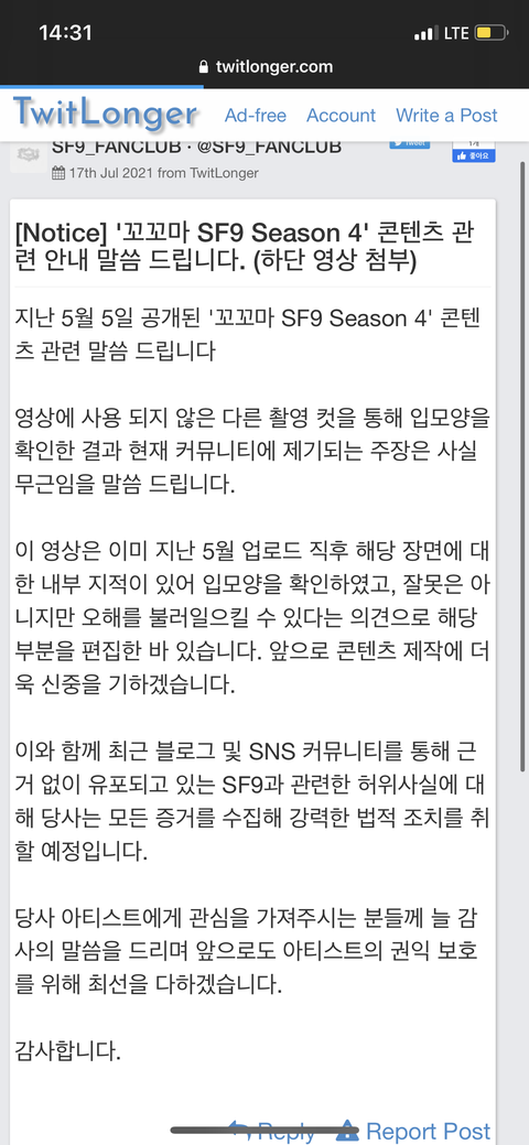이건 아까 허위사실 글인데 트위터인장 안보이게하라는 댓글엔 바로 피드백해서 바꾸더니 ㅠ 공식입장으로 고소미맥인다니까 바로 글삭 ㅠㅠ