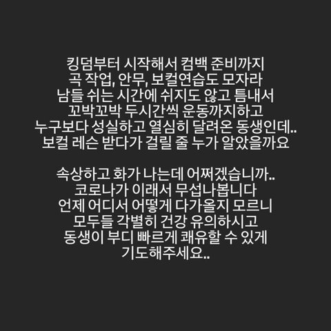 이어 "이민혁은 보건당국의 방역지침에 따라 필요한 조치와 함께 안정을 취하고 있으며 당사는 이민혁 군의 빠른 쾌유를 위해 최선을 다하도록 하겠다"며 "보건당국의 방역지침을 준수하여 아티스트의 건강과 안전을 위해 최선을 다하겠다"고 전했다.