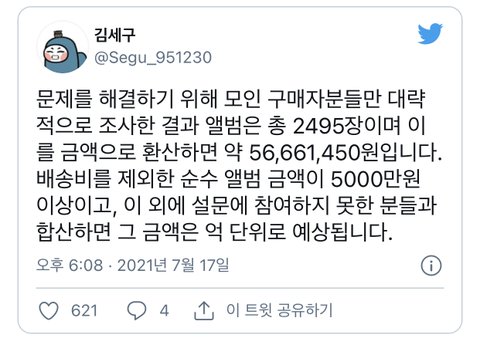 대략 17일 오전 11:00~오후4:30까지 총 5시간 반 동안 조사한 양이 국내 피해액(순수 앨범값만!!! 일본 배대지및 한국에서 일본으로 배송료는 포함하지 않음)만 약 5천만원임현재 점점 산출되는 피해액이 늘어나고 있음