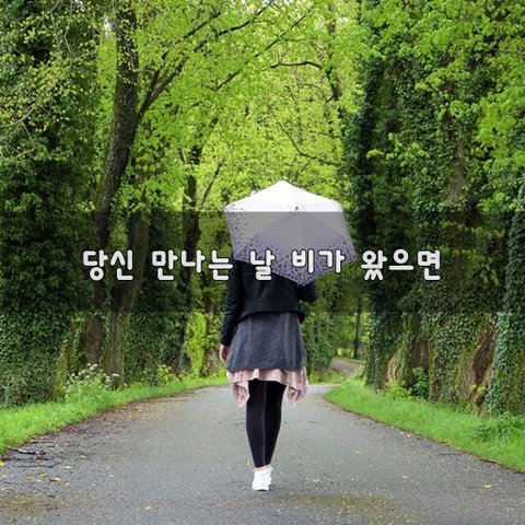 언제일지 모르지만 당신 만나는 날 비가 왔으면 좋겠습니다 물 고인 아스팔트 위를함께 우산 쓰고 찰방찰방 걸으며 우산으로 살짝 우리 얼굴 가리고 스릴 있는 입맞춤도 할 수 있으니까요 자판기 커피 한 잔씩 빼 들고 내리는 비 보며 우산 안에서의 낭만을 즐기고도 싶네요 내리는 빗 소리와 함께 사랑한다고 말하면 더욱더 아름답게 들리겠죠? 당신 만나는 날 내가 좋아하는비가 왔으면 좋겠네요