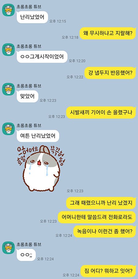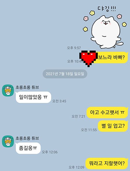M놈이 워낙 말빨로 잘 밀어붙이는 터이기도 하고 ㅈ양은 상황상 M놈에게 모든걸 의지해야만 하는 입장이라서 그런지 계속 말려드는 것 같아서 무시하라는 말을 수차례 더 했었고, 어제 오후 ㅈ양이 꽤 오랫동안 말이 없어 한번씩 '(이모티콘)댜깅!!!', '(아기이름)보느라 바빠?' 하고 안부를 물었습니다. M놈이 금요일에는 항상 집으로 오고 일요일에 다시 회사가 있는 지역으로 올라가기 때문에 목요일의 일로 ㅈ양에게 해를 가하진 않았는지 걱정이 되어서였습니다.ㅈ양은 제 안부에 새벽에야 '일이많았옹ㅠㅠ'하고 답을 주었습니다. 그냥 톡 했던 내용 사진으로 올리겠습니다. (너무 크면 보기 불편하실까봐 크기를 줄였고 아기 이름만 가렸습니다.)