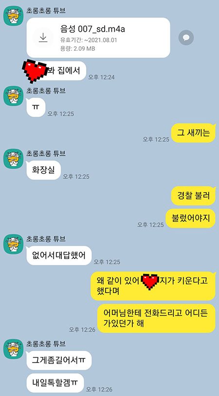 특히, 10)의 경우엔 최근 몇 달 전쯤인 21년도 초 정도에 일어난 일이었는데 ㅈ양이 M놈과 통화한 것을 녹음해 들려주었고 거기서 처음 확인하게 된 M놈의 실체는 상당히 충격적이었습니다.ㅈ양은 울면서 통화를 하고 있었고 M놈은 멍청한 년아, 개같은 년아, 말을 _같이 하게 만든다 등등의 폭언을 퍼붓고 있었고 통화가 이렇게 된 원인은 그 수당을 ㅈ양이 가져야 한다고 M놈에게 말을 했다가 그렇게 번진 것 같았습니다.통화내용은 꽤 길었지만 듣던 저는 너무 화가 나서 중반까지만 듣고 꺼버렸고, 동갑내기 톡방 친구인 ㄱ양도 저도 그 때부터 M놈을 좋게 봐주지 않았습니다.그 때 이혼하라는 말을 했었는데 ㅈ양이 상황상 이혼이 쉽지가 않았다고 했습니다.