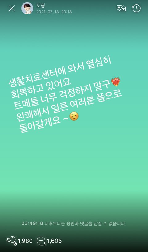 나 진짜 아무 것도 못 하고 팬톡도 못 들어오고 우울증 장난 아니었는데 이거 보고 길에서 걷다가 눈물 질질 짰어. 누가 보면 차인 줄 알았을 거야. 누나 기다릴게. 급하게 오지 말고 잘 치료하고 건강하게 돌아와 ㅠㅠㅠㅠㅠㅠㅠㅠ