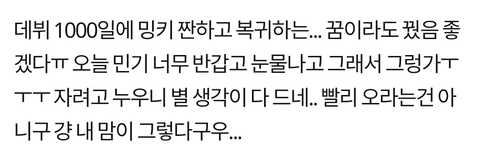 문득 들었던 생각 끄적였었는데.. 꿈이 아닌 현실로 이뤄져서 진짜 행복하다ㅜㅜㅜ 총공 마치고 바로 자야지 했는데 여운이 남아서 폰을 못내려놓는중..이제 공카에 민기 출첵 올라오고 브이앱 알림 뜨고 트윗 올라오겠지? 광분하지 말고 차분히 맞이해야지ㅠ 티니들 모두 굿밤해♥