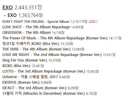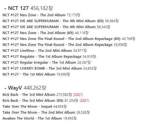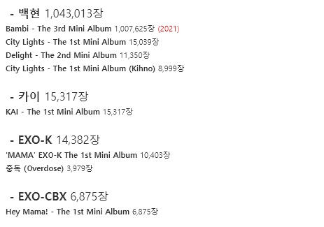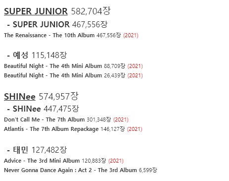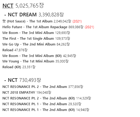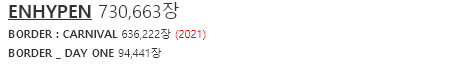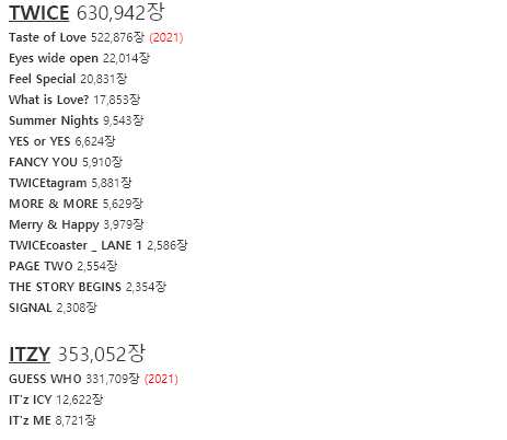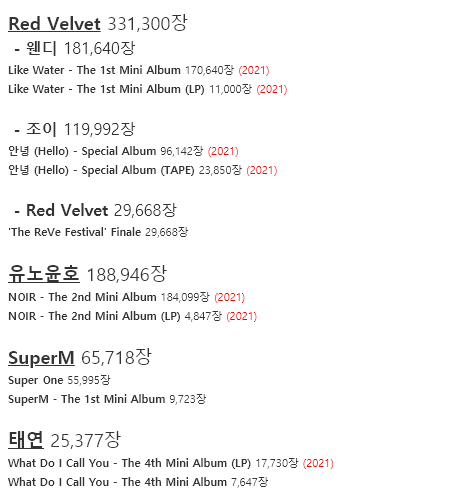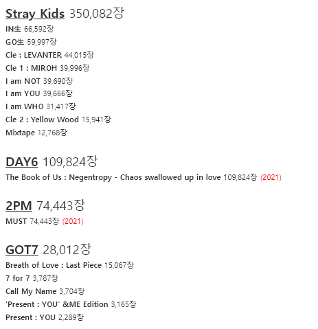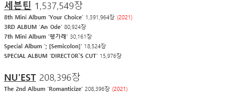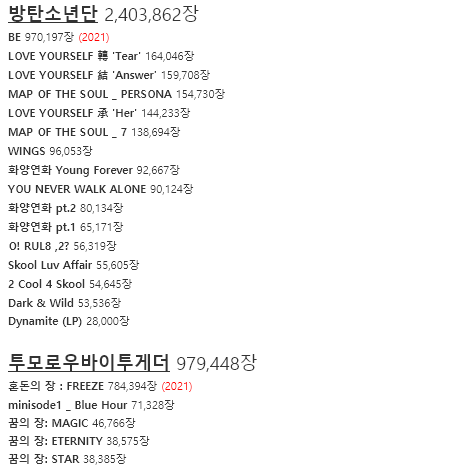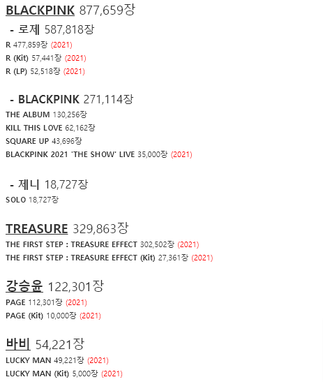 가온차트 2021년 1 ~ 6월 월간, 상반기 차트 기준(월간, 상반기 차트에서 마지막으로 확인되는 판매량)