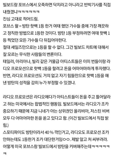 이제 포브스랑 빌보드도 아미들이 매수했다고 그러지