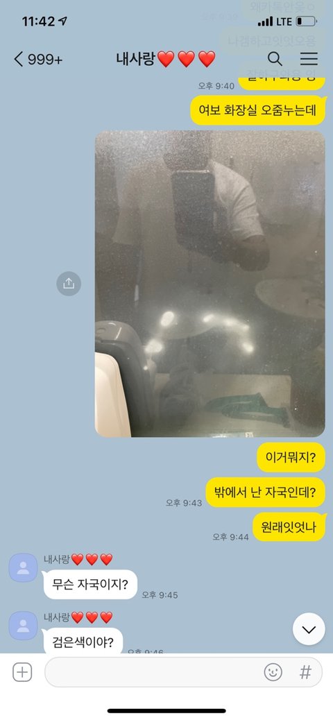 화장실에서 볼 일을 보려던 중 의문의 자국을 보았으며 여친에게 카톡을 보냈습니다.