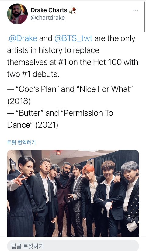 퍼투댄 1위 찍으니까 둘이 같이 찍은 사진 올리면서 방탄이랑 드레이크가 핫샷으로 핫샷을 밀어낸 유일한 아티스트들이라고 트윗해줌