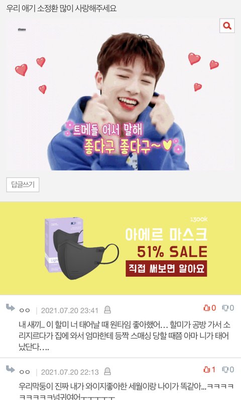 그러나저러나 얘랑 도영이 그 어린 것들이 지금 코 머시기 때문에 아파서 치료 받고 있는데 쾌유 좀 빌어주자.