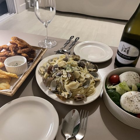 부라타치즈샐러드&봉골레파스타랑 대구튀김&어니언링