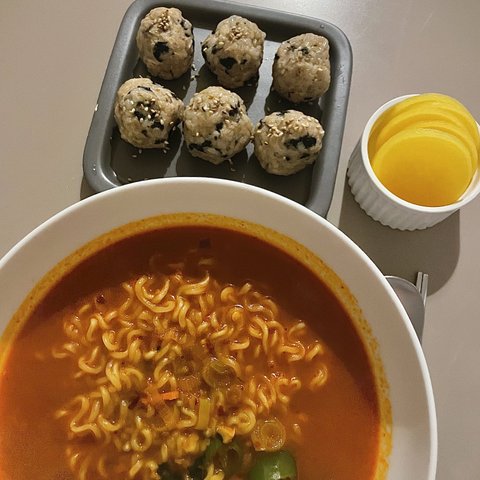 완전 얼큰하게끓인 라면이랑 참치마요주먹밥
