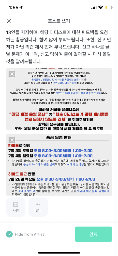 1. 22일과 23일에 진행하는 총공은 하이드를 풀고 하지만, 총공 홍보는 하이드 꼭 달아주기.